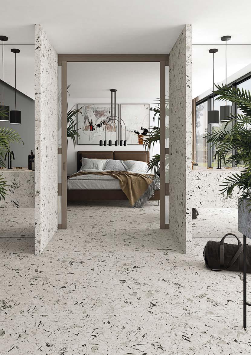 Vives explores the terrazzo effect with its Luna collection. Luna’s design is inspired by marble pieces set into cement. It evolves around one model in three colours: White, Grey, and Black. Each design boasts two finishes: polished and matte. Both are rectified to visually eliminate the edge of the tiles, generating a continuous surface and increase the sensation space.