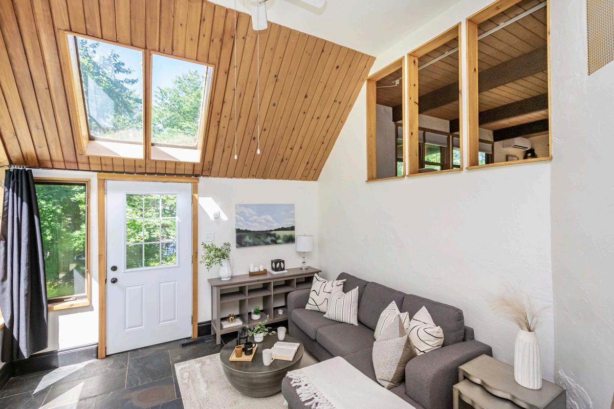 MAIN LEVEL: LIVING ROOM WITH WOOD BURNING FIREPLACE, DUCTLESS HEAT PUMP AND HARDWOOD FLOORS
