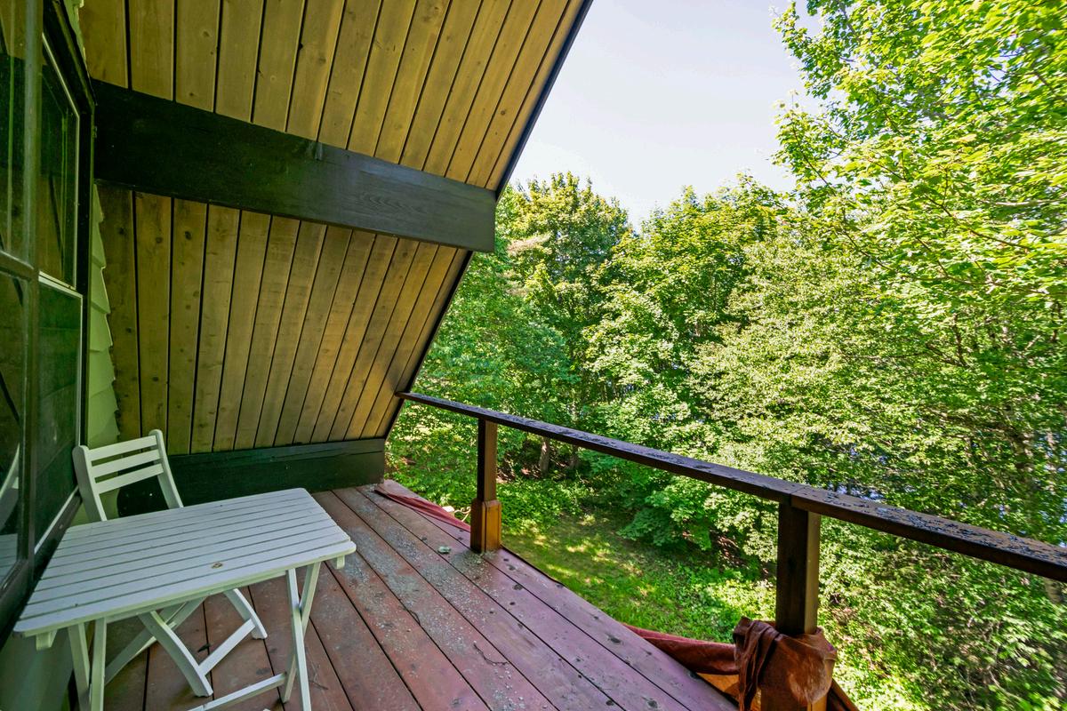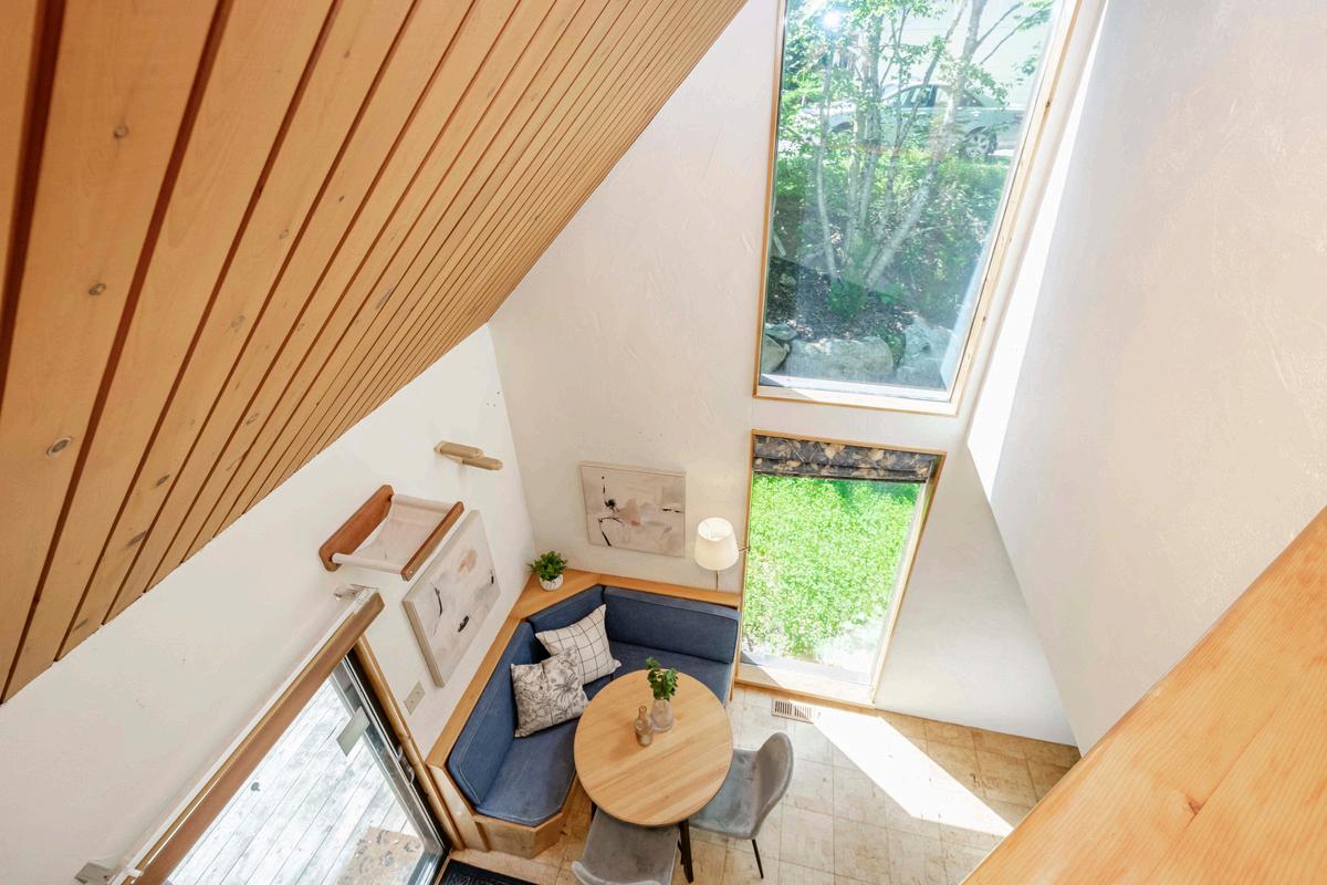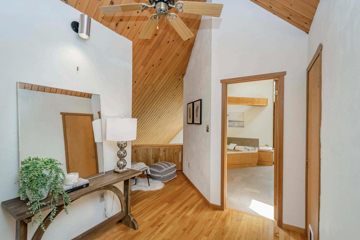 UPPER LEVEL: PRIMARY BEDROOM WITH DECK, SECOND BEDROOM, BATH WITH JET TUB, COZY NOOK SPACE OVERLOOKING BELOW