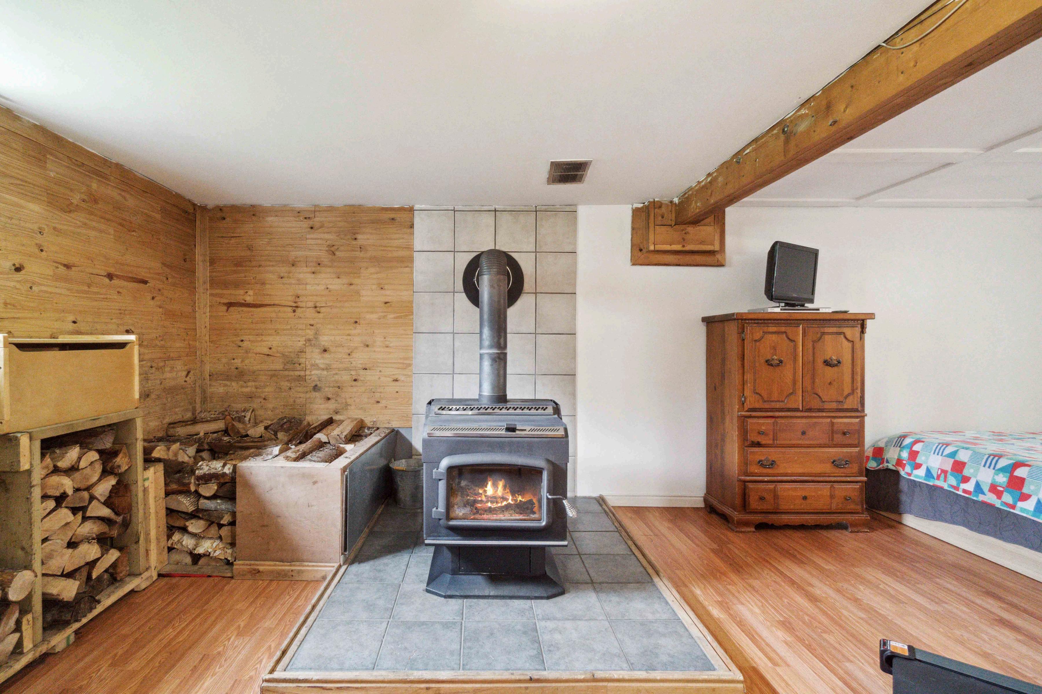 A wood stove efficiently assists with heating the home during the winter, adding both warmth and charm to the living space.