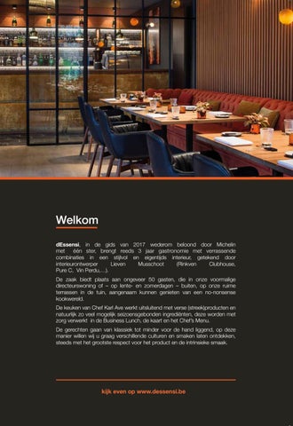 Welkom dEssensi, in de gids van 2017 wederom beloond door Michelin met één ster, brengt reeds 3 jaar gastronomie met verrassende combinaties in een stijlvol en eigentijds interieur, getekend door interieurontwerper Lieven Musschoot (Rinkven Clubhouse, Pure C, Vin Perdu,…). De zaak biedt plaats aan ongeveer 50 gasten, die in onze voormalige directeurswoning of – op lente- en zomerdagen – buiten, op onze ruime terrassen in de tuin, aangenaam kunnen genieten van een no-nonsense kookwereld. De keuken van Chef Karl Ave werkt uitsluitend met verse (streek)producten en natuurlijk zo veel mogelijk seizoensgebonden ingrediënten, deze worden met zorg verwerkt in de Business Lunch, de kaart en het Chef’s Menu. De gerechten gaan van klassiek tot minder voor de hand liggend, op deze manier willen wij u graag verschillende culturen en smaken laten ontdekken, steeds met het grootste respect voor het product en de intrinsieke smaak.