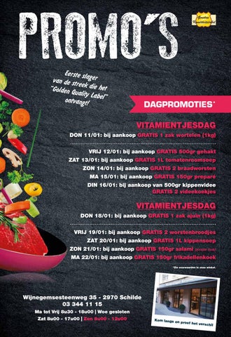 DON 11/01: bij aankoop GRATIS 1 zak wortelen (1kg) VRIJ 12/01: bij aankoop GRATIS 500gr gehakt ZAT 13/01: bij aankoop GRATIS 1L tomatenroomsoep ZON 14/01: bij aankoop GRATIS 2 braadworsten MA 15/01: bij aankoop GRATIS 150gr preparé DIN 16/01: bij aankoop van 500gr kippenvidee GRATIS 2 videekoekjes