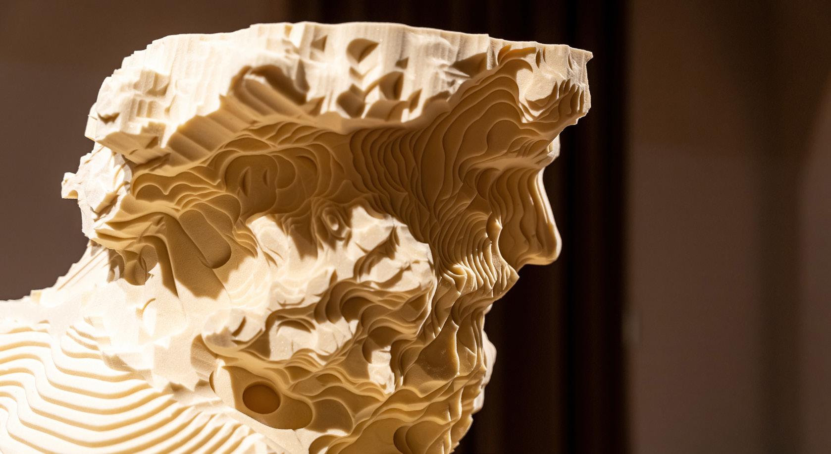 Il braccio robotico si fa strada attraverso la materia utilizzando complesse strategie computazionali. La mano dell’artista è sostituita dalla gestualità algoritmica della macchina che permette un infinito numero di possibilità praticabili.
