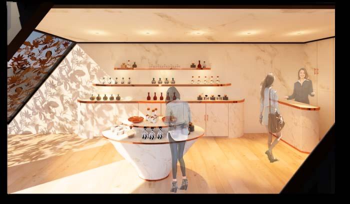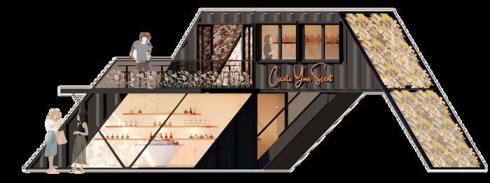 Focusingonthesenseofsmell,popupprovides guestswithaperfumeshopdownstairsanda laboratoryupstairstocreateyourownscent whilepromotingtheSensesHotel.Theformis inspiredbyadeconstructedperfumebottle.