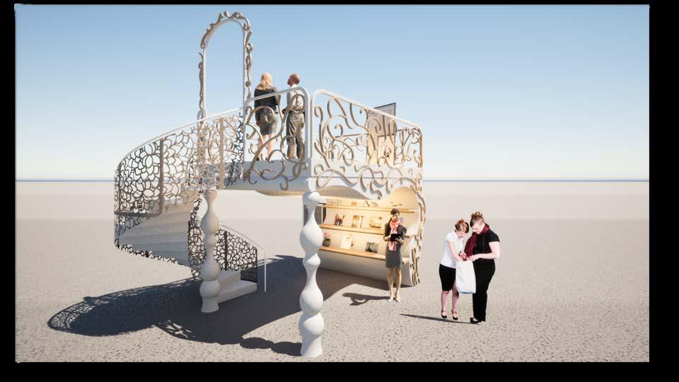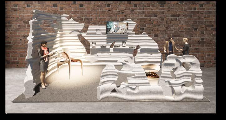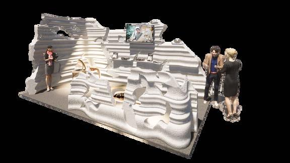 Thisuniqueexhibitiondesignuses curvedstructuralformsand whiplashlinesthatcreatethevine likedesignrelatingittotheArt Nouveaumovement.