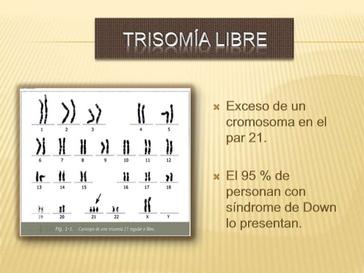1, Trisomía libre. - La trisomía libre (CIE-10 Q90.0), también conocida como trisomía 21 meiótica no disyuntiva, es la forma de síndrome de Down más común y es el origen del 95% de los casos Se produce por un error durante la formación de los gametos, en concreto durante la fase de disyunción del material genético Es similar a lo que ocurre en la mayoría de casos de muchas otras trisomías, como la trisomía X La disyunción es la fase de la meiosis en la que dos cromosomas homólogos se separan de modo que el gameto descendiente, ya sea un óvulo o un espermatozoide, queda con la mitad de la información genética que los progenitores La no disyunción es un error en esta fase; el par de cromosomas no se separa y el gameto queda con un cromosoma extra. La trisomía libre se asocia con el deterioro del material genético, principalmente por la edad, pero no es hereditaria. En un 15% de los casos es transmitida por los espermatozoides y en un 85% por los óvulos