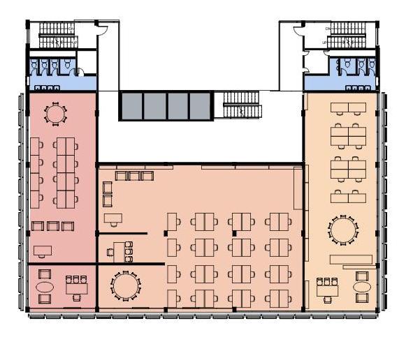 AXONOMETRIC EXPLODE OF THE 5 DIFFERENT USE OF FLOOR AREA WITHIN THE BUILDING