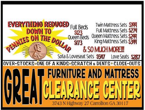 5 West GeorGia’s Direct Mail ansWer since 1987 THE WEST GEORGIA SHOPPER • NOVEMBER 16, 2022 4279 North US 27 Carrollton, Georgia OPEN: MONDAY-SATURDAY 10AM-6PM 770.830.0880 *EXCLUDES MATTRESSES NOW OPEN! SOFA & LOVE SEAT SETS STARTING AS LOW AS $599 4 PIECE BEDROOM SETS STARTING AS LOW AS $1099 DELIVERY AND SET-UP AVAILABLE RECLINERS STARTING AS LOW AS $299 LARGE SELECTION OF ACCENT CHAIRS