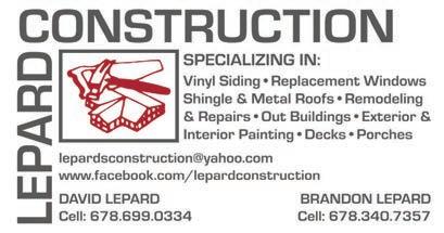 6 THE WEST GEORGIA SHOPPER • APRIL 17, 2024 West GeorGia’s Direct Mail ansWer since 1987 WEST GEORGIA FORKLIFT REPAIR SERVICE, INC. FAMILY OWNED & OPERATED BY Cary & Cindy Stephens Proudly Serving Carroll County for Over 28 Years! 730 Kingsbridge Road • Carrollton 24 HOUR SERVICE - 7 DAYS A WEEK! WE SELL FORKLIFTS Forklift Repair on All Brands LP/Diesel/Electric Construction Equipment -> Buy and Sell Equipment -> Rentals & Used Equipment -> New Forklift Attachments -> Parts for All Makes & Models -> Hydraulic Cylinder Repair -> LP Gas Pump Station (On-Site) -> Make Hydraulic Hose (In House & On-Site) -> Most Repairs Done On-Site -> Full Equipment Shop & Service Vehicles -> Tire Replacement On-Site -> Portable Steam Clean, Weld & Tire Press -> Industrial Battery & Charger Repair 678.314.1408 LICENSE & INSURED 35+ YEARS EXPERIENCE NO EXTRA CHARGE FOR AFTER HOURS! NO CHARGE FOR AFTER HOURS! Vinyl Siding • Soffit/Fascia • Hardie Plank Siding Siding Repairs • Metal/Shingle Roofs • Shutters Gutters & Guards • Replacement Windows Deck Underpinning & Undercover ALL WORK GUARANTEED! INSURED! FREE ESTIMATES! CALL FOR MORE INFO ABOUT EXTRA SAVINGS! 678.273.6442 RECYCLING B&D RECYCLING B&D 770-824-5111 40 WINDY LAKE RD. BREMEN, GEORGIA TOP $$$ FOR JUNK CARS! TOP $$$ FOR JUNK CARS! 8 FAMILY YARD SALE WED.-SAT. APRIL 17TH - 20TH 8AM UNTIL ??? 3465 S. HWY 27 CARROLLTON, GEORGIA RZR 800 • 14’ Utility Trailer PS4 • 2014 Chevy Malibu Kawasaki 220 4-Wheeler Furniture • Clothes • Kids Items Household Items 8x10 Building Kit Building Materials • Hardware Tools • Antique Picture Frames Commemorative Coke Bottles PLUS LOTS MORE! Gates Open at 6:00 pm Rodeo at 8:00 pm FRIDAY & SATURDAY April 19th & 20th Heard Co. Covered Arena 12080 Hwy 100 • Franklin, Ga BULL RIDING • TEAM ROPING • CALF ROPING BARREL RACING • STEER WRESTLING BAREBACK BRONC RIDING Adults (12 & Over)... $20 Ages 4-11 Years... $10 AGES 3 AND UNDER FREE CASH OR DEBIT/CREDIT Sponsors: Oubre Rodeo Company, Georgia Power, Southern Power, Scott Evans Auto Group, Jack Peek’s Sales, Inc., Dollar Heating & Air, Piedmont Newnan, West Georgia Technical College, Addison Smith Heating & Cooling, Oglethorpe Power, Eagle 102.3, Good to Go Cooling & Heating, West GA Paint & Body, A&E Metal Roofing, Heard County Republican Party, ALA-GA Roll Off Container, Tiffany Carter Agency-American Family Insurance