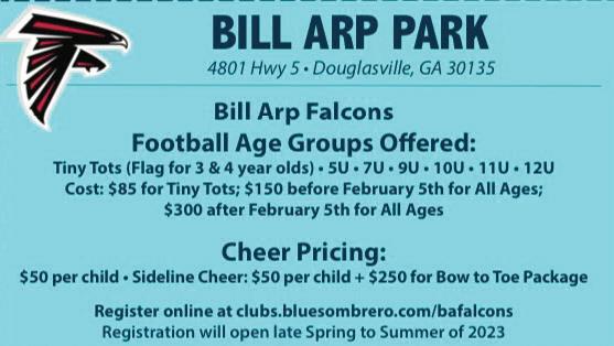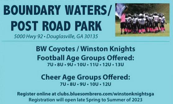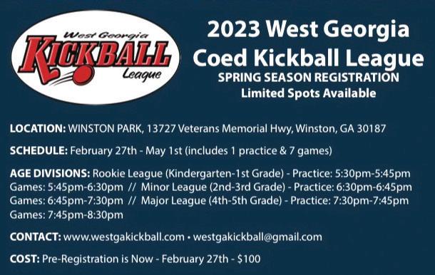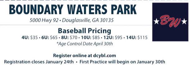 11 West GeorGia’s Direct Mail ansWer since 1987 THE WEST GEORGIA SHOPPER • JANUARY 11, 2023 DOUGLAS COUNTY PARKS & RECREATION Follow Us on Facebook & Instagram Douglas County Parks & Recreation Douglas County Parks & Rec Baseball Pricing 4U: $65 • 6U: $125 • 8U: $140 10U: $145 • 12U: $155 • 14U: $165 *Age Control Date April 30th Softball Pricing 6U: $125 • 8U: $140 10U: $145 • 12U: $155 • 14U: $165 *Age Control Date January 1st LITHIA SPRINGS PARK 2922 S. Sweerwater Rd. • Lithia Springs, GA 30122 Baseball Pricing 4U: $50 • 6U: $70 • 8U: $80 10U: $90 • 12U: $90 • 14U: $100 *Age Control Date April 30th Softball Pricing 6U: $60 • 8U: $80 10U: $90 • 12U: $90 *Age Control Date January 1st Register online at secure.rec1.com Registration closes January 31st First practice will begin on February 6th Come Join Us! Spring 2023