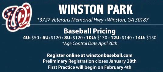11 West GeorGia’s Direct Mail ansWer since 1987 THE WEST GEORGIA SHOPPER • DECEMBER 28, 2022 DOUGLAS COUNTY PARKS & RECREATION Follow Us on Facebook & Instagram Douglas County Parks & Recreation Douglas County Parks & Rec Baseball Pricing 4U: $65 • 6U: $125 • 8U: $140 10U: $145 • 12U: $155 • 14U: $165 *Age Control Date April 30th Softball Pricing 6U: $125 • 8U: $140 10U: $145 • 12U: $155 • 14U: $165 *Age Control Date January 1st LITHIA SPRINGS PARK 2922 S. Sweerwater Rd. • Lithia Springs, GA 30122 Baseball Pricing 4U: $50 • 6U: $70 • 8U: $80 10U: $90 • 12U: $90 • 14U: $100 *Age Control Date April 30th Softball Pricing 6U: $60 • 8U: $80 10U: $90 • 12U: $90 *Age Control Date January 1st Register online at secure.rec1.com Registration closes January 31st First practice will begin on February 6th Come Join Us! Spring 2023