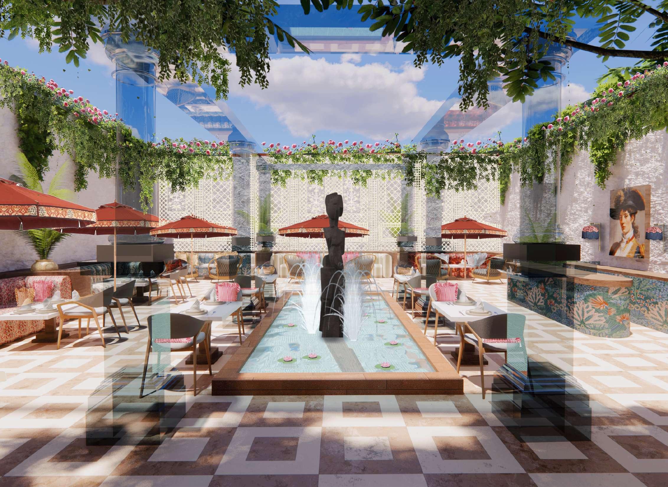 "La Joséphine" is a courtyard in a hotel that defies gender norms, blending masculine architecture with vibrant colors and nature's raw elegance.