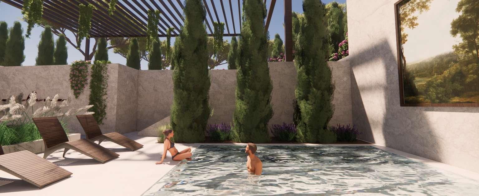 The central heart of the quarry lies upon the stone fountain and steps. Opposing the steps are the spa baths integrated into the quarry itself. Creating an open, elegeant, an inviting space promoting ulimtate relaxation.