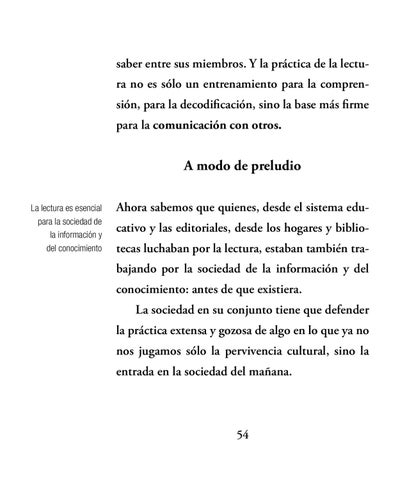 Ahora sabemos que quienes, desde el sistema educativo y las editoriales, desde los hogares y bibliotecas luchaban por la lectura, estaban también trabajando por la sociedad de la información y del conocimiento: antes de que existiera. La sociedad en su conjunto tiene que defender la práctica extensa y gozosa de algo en lo que ya no nos jugamos sólo la pervivencia cultural, sino la entrada en la sociedad del mañana.