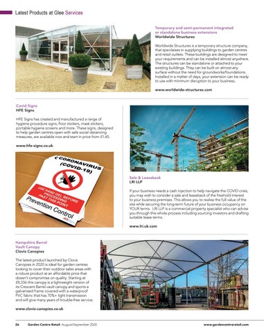 Latest Produ cts at G lee Serv ices Temporary and semi-permanent integrated or standalone business extensions Worldwide Structures Worldwide Structures is a temporary structure company, that specilaises in supplying buildings to garden centres and retail outlets. These buildings are designed to meet your requirements and can be installed almost anywhere. The structures can be standalone or attached to your existing buildings. They can be built on almost any surface without the need for groundworks/foundations. Installed in a matter of days, your extension can be ready to use with minimum disruption to your business. www.worldwide-structures.com
