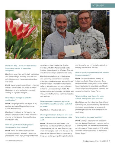 Institute (Kirstenbosch) for 17 years. This role included show design- and here I am today. Ray: I obtained a Diploma in Horticulture