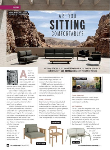 OUTDOOR SEATING PLAYS AN IMPORTANT ROLE IN THE GARDEN, SO WHAT’S ON THE MARKET? ANJI CONNELL HIGHLIGHTS THE LATEST TRENDS structural systems and finishes that withstand the triple threat of sun exposure, humidity and corrosion. OISIDE has three new collections in collaboration with Barcelona-based Spanish designer Francesc Rifé whose work takes inspiration from minimalism, material honesty, spatial order, and geometric proportion. Beam Collection Beam has an architectural quality that juxtaposes different slats' planes and sizes, lending each piece a subtle graphic expression characterised by their generous, thoughtful and rectilinear volumes. The minimal architectural pieces have a structured framing in solid Iroko African Teak, and generous squishy cushioning. PENDA CHAIR