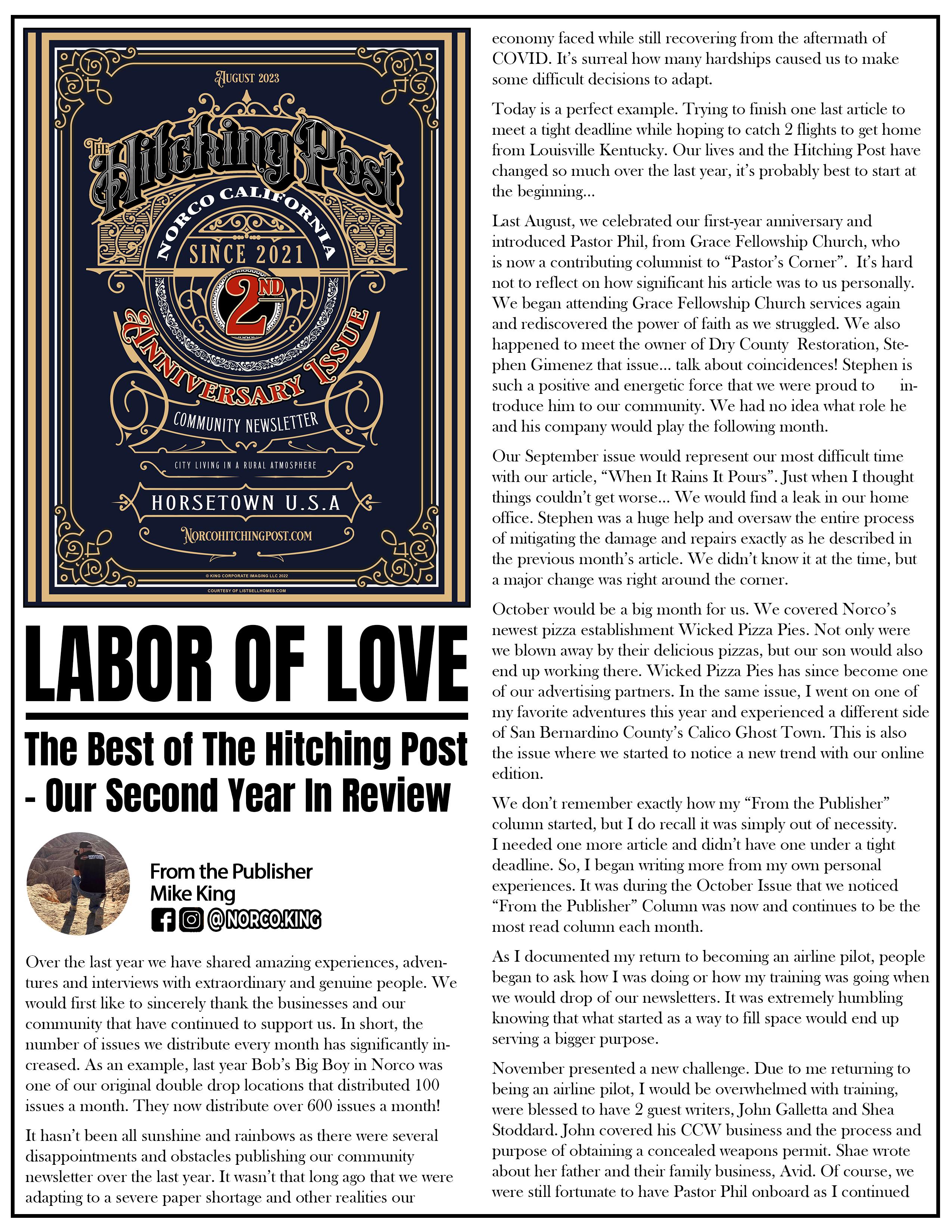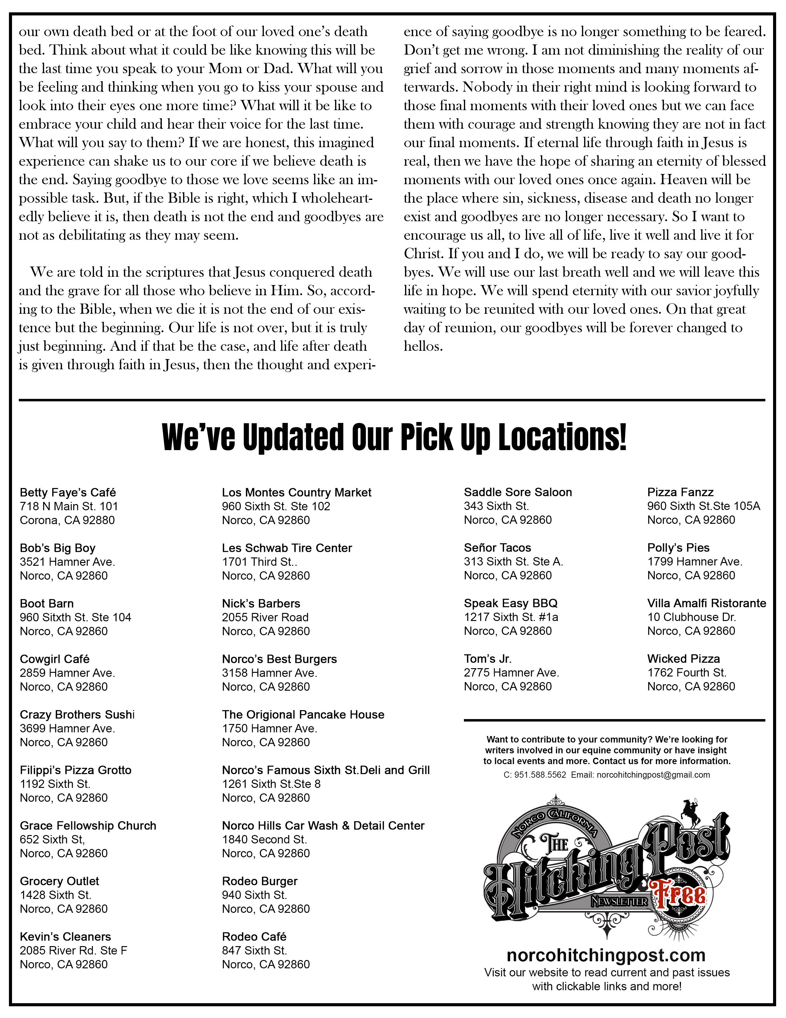 In this issue we celebrate our second year anniversary serving Norco, CA., Horsetown USA! Read about our year in review in, "Labor of Love" followed by the, "Art of Compassion" where we meet Rich Martinez, the owner of Norco's Ghost Town Tattoo. We also review YouTube's hit show, Hot Ones and their season 21 hot sauces in, "Tears of Joy?". Finally, in Pastor's Corner, Pastor Phil writes a very touching article, "Saying Goodbye". We have also included an updated list of pickup location for the Hitching Post.