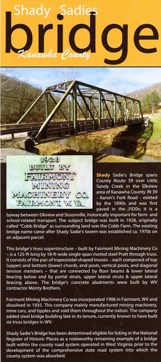 Richard Bashlor of the Elk River Communities in Kanawha County Museum shared this month’s Elk Reflects: Shady Sadie’s Bridge which crosses Little Sandy Creek on Aaron’s Fork Road in Elkview. Bashlor said the bridge was built in 1928. Judith Skidmore commented, “Sadie’s last name was Summers. She originally owned the Shawnee Tea Room on the Shawnee straight-stretch below Elkview.”