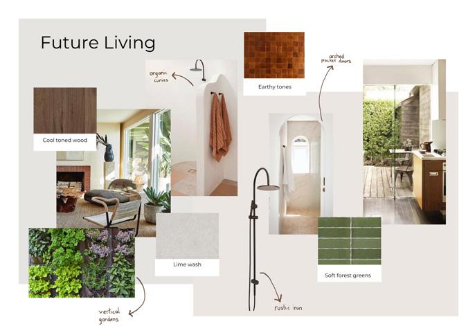 When discussing the ambiance board, my partner Rhianna and I wanted to ensure the spacer felt inspired by nature. Our main interest lies in using soft, organic shapes and shades of brown, green and beige that felt taken straight from our natural environment. Because our key design feature is the indoor outdoor kitchen, it only feels natural for us to take this aesthetic route.