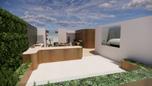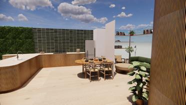 Due to the size of our space, 89m2, we were able to create an open plan living, dining, kitchen and garden. Our key design feature is the indoor outdoor kitchen which shares a bench, connected to a garden bed that follows the perimeter of the balcony. In this way, the occupants are able to grow their own produce, reducing cost and cost of living pressures.