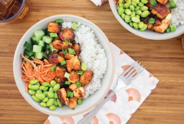 5.Servir el salmón encima del arroz, cubrir con las zanahorias frescas, el pepino, las cebollas, el edamame descongelado.