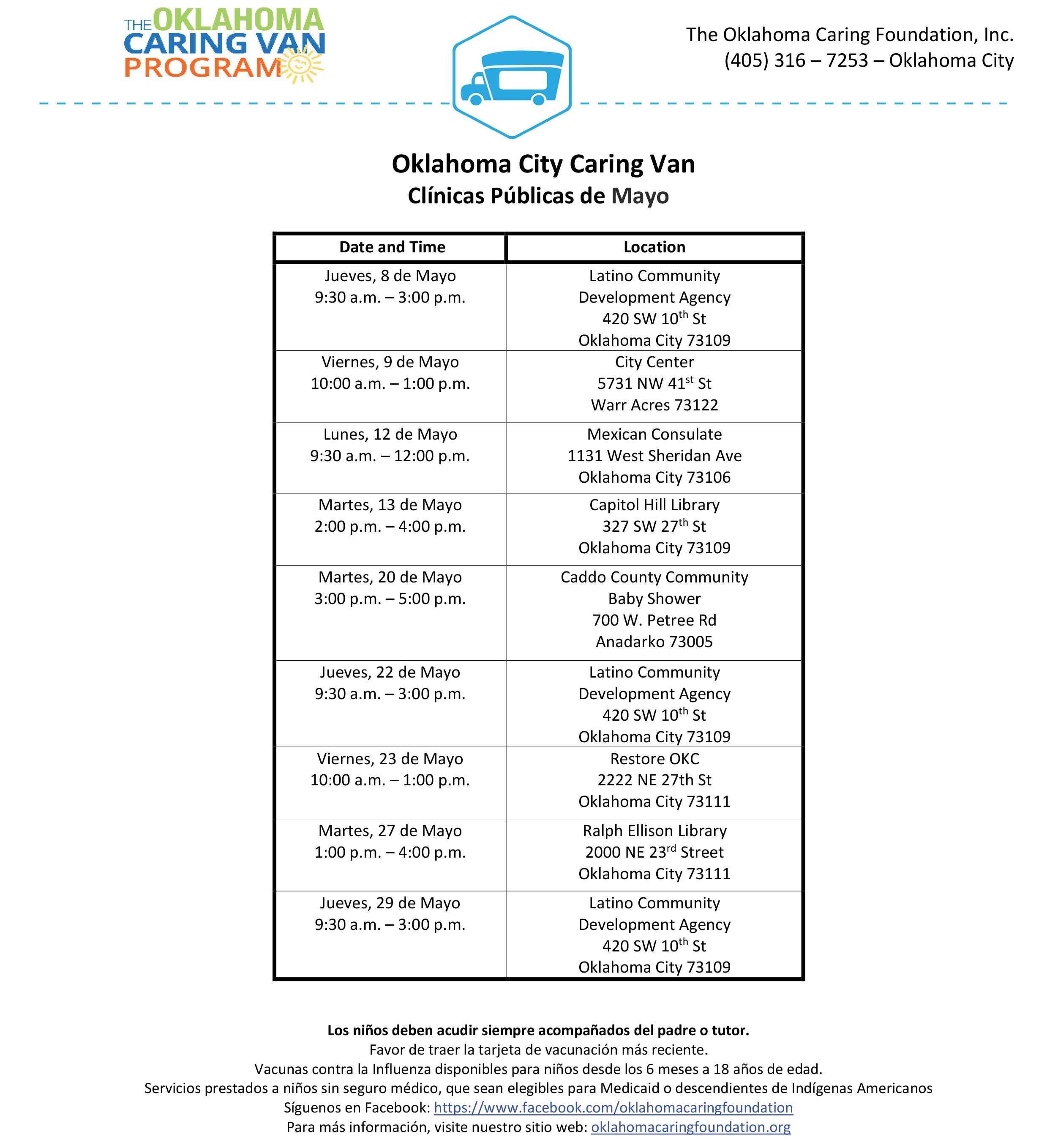 Caring Van en Oklahoma City y Tulsa que se llevarán a cabo en Mayo. Puede encontrar un calendario completo de clínicas en oklahomacaringfoundation.org. o en Facebook en facebook.com/ oklahomacaringfoundation.
