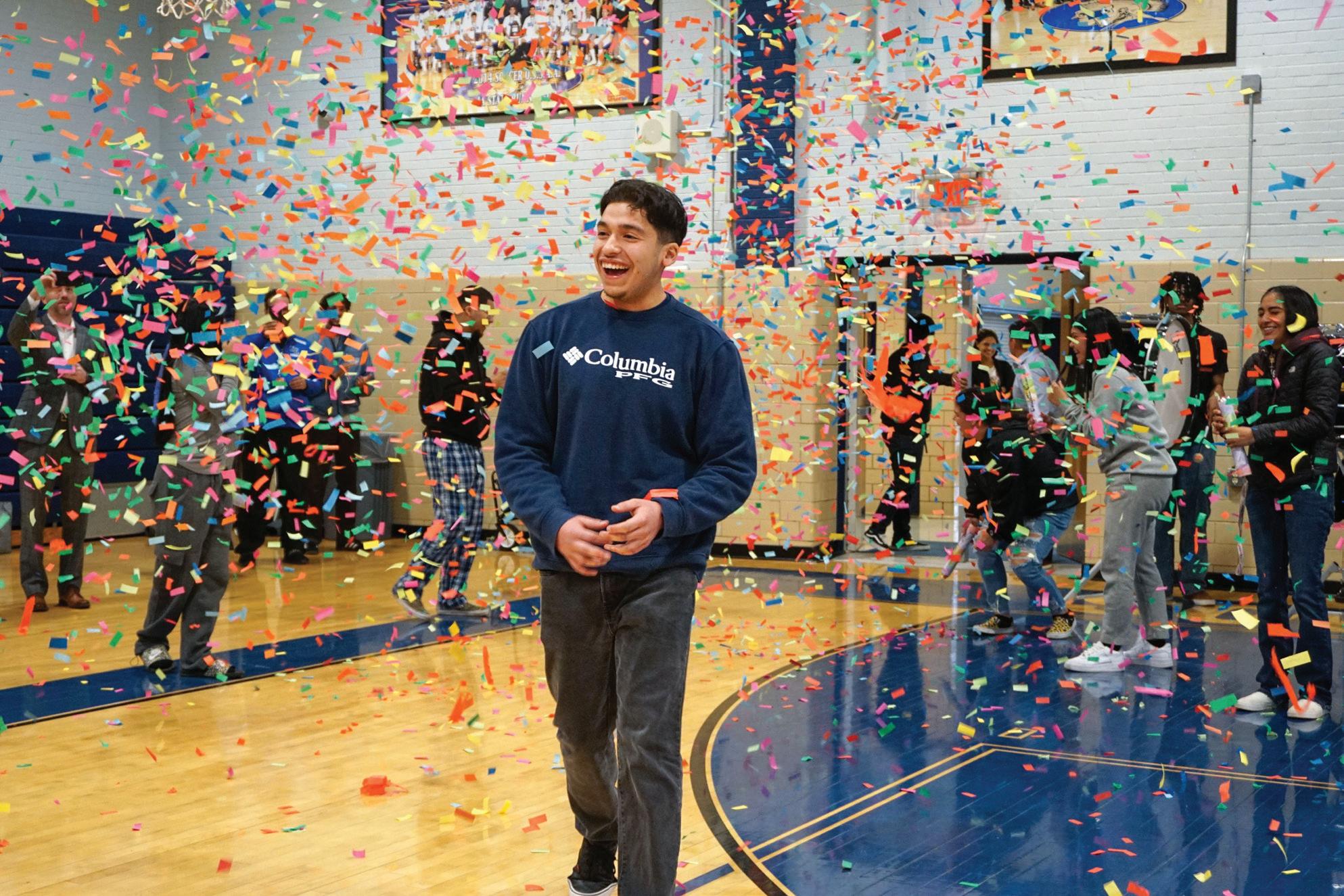 Compañeros de clase, personal administrativo de la escuela, maestros, mentores, representantes de Oklahoma Gas & Electric Co. (OG&E), el Superintendente Sean McDaniel, el Alcalde de OKC David Holt y miembros de la comunidad se reunieron en Southeast High School para acompañar a Jorge, celebrar sus logros académicos y felicitarlo mientras los funcionarios de OG&E lo sorprendían con la noticia de que había recibido la beca. Gracias a la ayuda financiera proporcionada por la beca Positive Energy, Jorge ahora podrá asistir a la Universidad de Oklahoma y especializarse en la carrera de ciencias de la computación y programación sin la carga financiera que implica el estudiar una carrera universitaria.