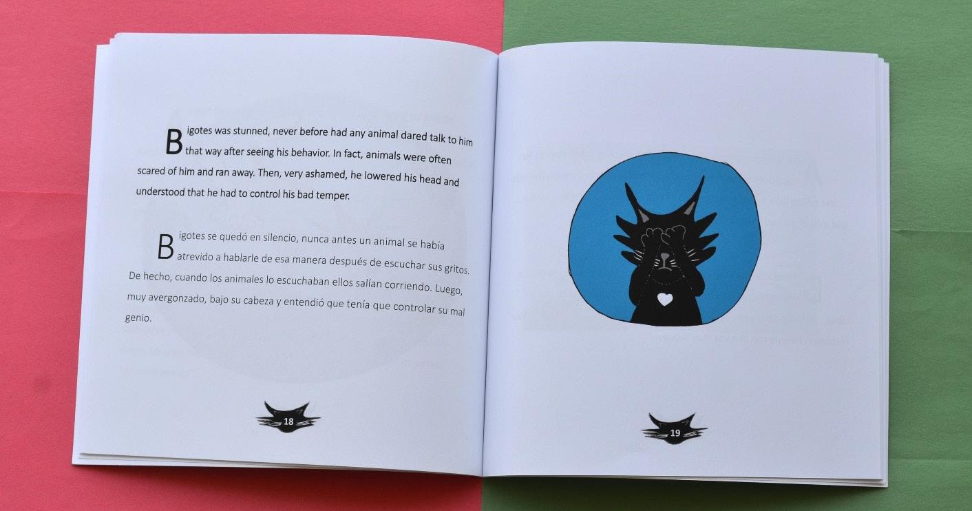 que tengan una palabra por página. A los dos años ya le puedes contar historias cortas, recuerda- su atención es muy corta. Entonces, si no le presta atención a la lectura, solo enfócate en las ilustraciones. Un cuento corto que puedes presentarlo a esa edad se titula, “El Mal Genio de Bigotes.” Lo consigues en Amazon, aunque si no tienes Amazon también me puedes agregar en FB y hacer un pedido enviándome un mensaje. Me encuentras como “Janeth with a Y”