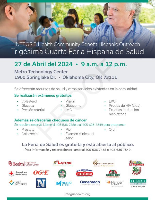 Oklahoma City.- El programa de Alcance Hispano de Beneficio Comunitario de INTEGRIS Health lo invita a participar en la 34ª Feria Anual de Salud Hispana y Clínica Móvil. “La Feria de Salud Hispana es un importante alcance estratégico en la misión de INTEGRIS Health de asociarse con las personas para vivir vidas más saludables” dijo Carmen Romo-Directora de Alcance Comunitario de Integris Health. El evento es gratuito para el público y se llevará a cabo desde las 9 a.m. hasta el mediodía del sábado 27 de abril en el Centro de Tecnología de Metro, ubicado en 1900