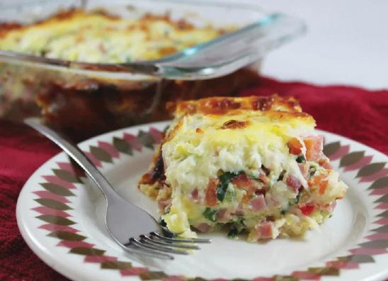 4. Rociar aceite en una bandeja para hornear. Esparcir la mezcla de vegetales y jamón de manera uniforme en la bandeja. Verter la mez- cla de huevo encima de los vegetales. Cubrir con el queso restante.