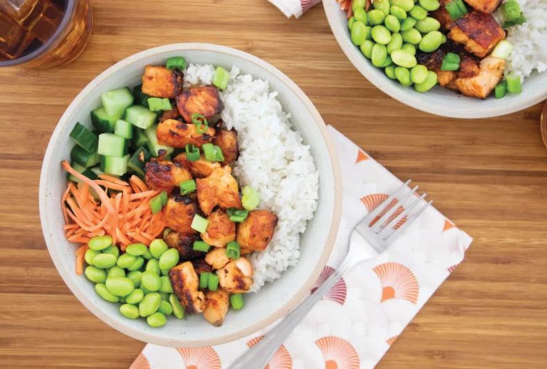 5. Servir el salmón encima del arroz, cubrir con las zanahorias frescas, el pepino, las cebollas, el edamame descongelado.
