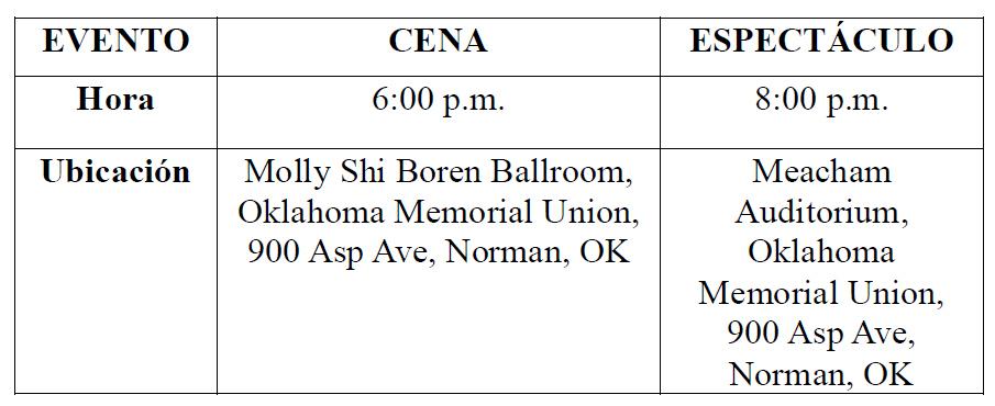 El evento se celebrará en el Oklahoma Memorial Union, 900 Asp Avenue, Norman, OK. Antes del espectáculo los asistentes disfrutarán de un plato típico colombiano. La cena será servida a las 6.00pm, en el Molly Shi Boren