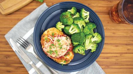 5. En una olla pequeña, calentar la salsa de to- mate por 2-3 minutos. Antes de retirar del sartén, añadir la salsa y el queso encima del pollo. Servir cuando el queso esté derretido.