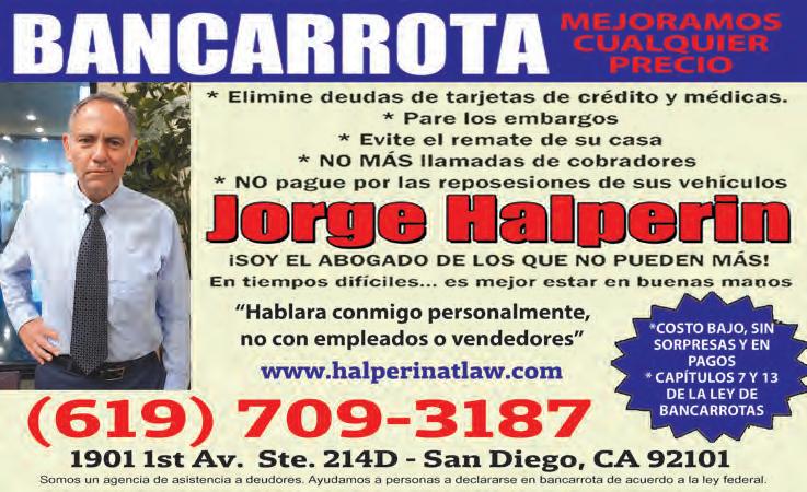 Ventas, Clasificados y Eventos. T: 619.426.1491 • sales@ellatino.net • 1105 BROADWAY SUITE #206 CHULA VISTA CA 91911 San Diego County’s Largest Hispanic Newspaper Cubriendo todo el condado de San Diego EDICIÓN 27 VOLÚMEN XXXV ESTABLECIDO EN 1988 www.ellatinoonline.com EJEMPLAR GRATUITO JUN 30 A JUL 6, 2023 Por el derrame de aguas negras a playas de SD, aprueba la Junta de Supervisores Declaratoria de EMERGENCIA Pese a los anuncios de prohibición de internarse al agua debido a la contaminación de las mismas, muchas personas hacen caso omiso, exponiéndose a dañar su salud como es el caso de esta pareja en Imperial Beach. Foto: Horacio Rentería/El Latino SD. Tiene el cómic un poder para el cambio ENTRET. PÁG.12 AL DÍA PÁG.8