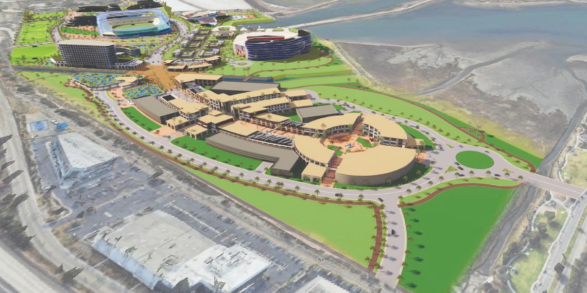 Diseñado sobre una extensión de 124 acres en las inmediaciones de la marina y el distrito Otay, el complejo será impulsado por The McGarey Group en colaboración con la Ciudad de Chula Vista y el Puerto de San Diego. El plan contempla una combinación de infraestructura deportiva de alto nivel, espacios de recreación, hospedaje, comercio y tecnología, lo que lo convertiría en uno de los desarrollos más ambiciosos del sur del estado. Entre los componentes clave del distrito figuran tres hoteles con capacidad para 700 habitaciones, un centro profesional de tenis respaldado por una estrella deportiva aún no revelada, una academia de polo acuático, dos campos de golf, un cine IMAX, un estadio multiusos y más de 300 mil pies cuadrados de espacio comercial.
