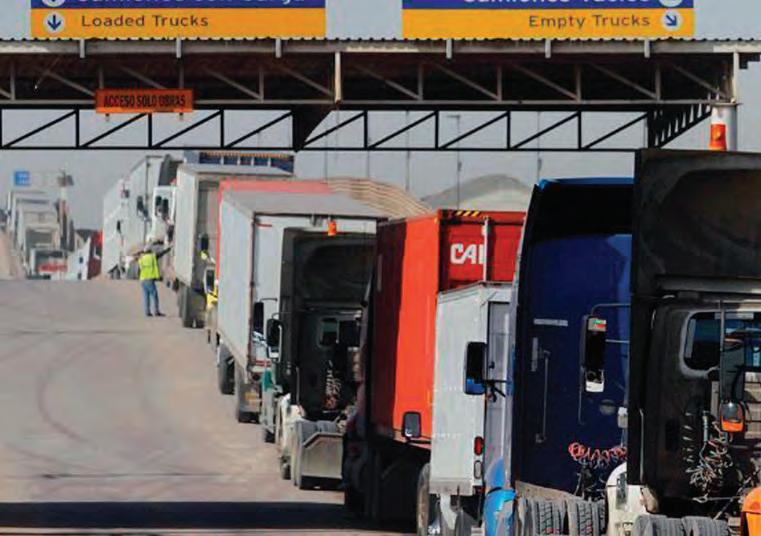 Esta “política comercial de Estados Unidos en 2025 tiene una disrupción en las cadenas de suministro” y genera tensiones fronterizas, advirtió el Dr. Alejandro Díaz-Bautista. Vehículos de carga en la aduana de Otay Mesa. Foto: Ntyt.com.mx