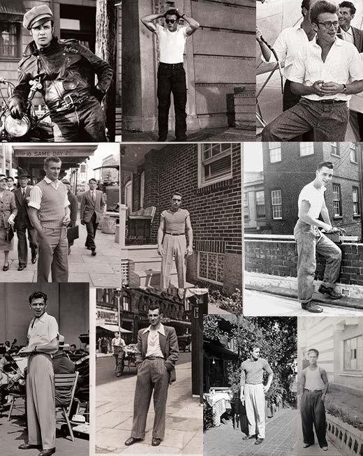 After the war was a time of strict uniform policies and structures mens wear became a lot more relaxed and casual to show the change in responsibilities. With the media mens wear changed a lot from structured tailored suits to jeans and t-shirts which was made popular by Marlon Brando when he played Stanley in a Streetcar Named Desire, the look of the working class became a popular trend.