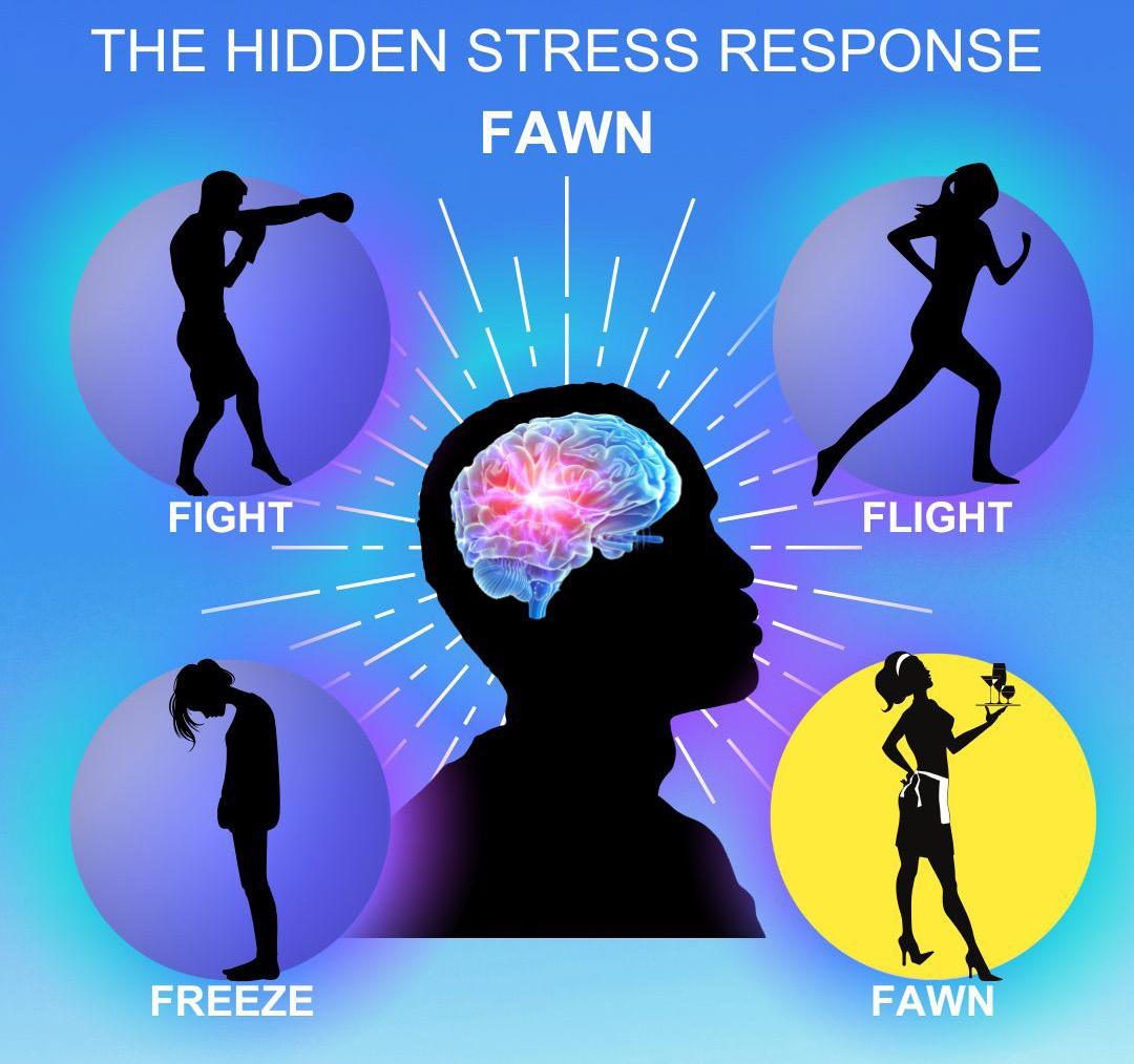 Las respuestas ocultas al estrés pueden afectar tu bienestar. No solo reaccionamos con lucha, huida o congelación, sino también con sumisión. ¡Busca apoyo si necesitas ayuda para comunicar tus límites y decir "no". Gráfca por Jessica de Laguna