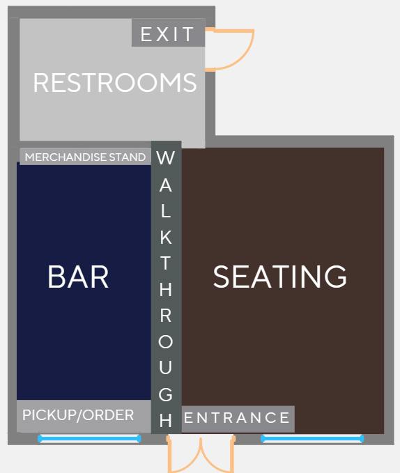 Mezz Floor- Located Upstairs ADA and gender inclusive bathrooms, storage and office space.
