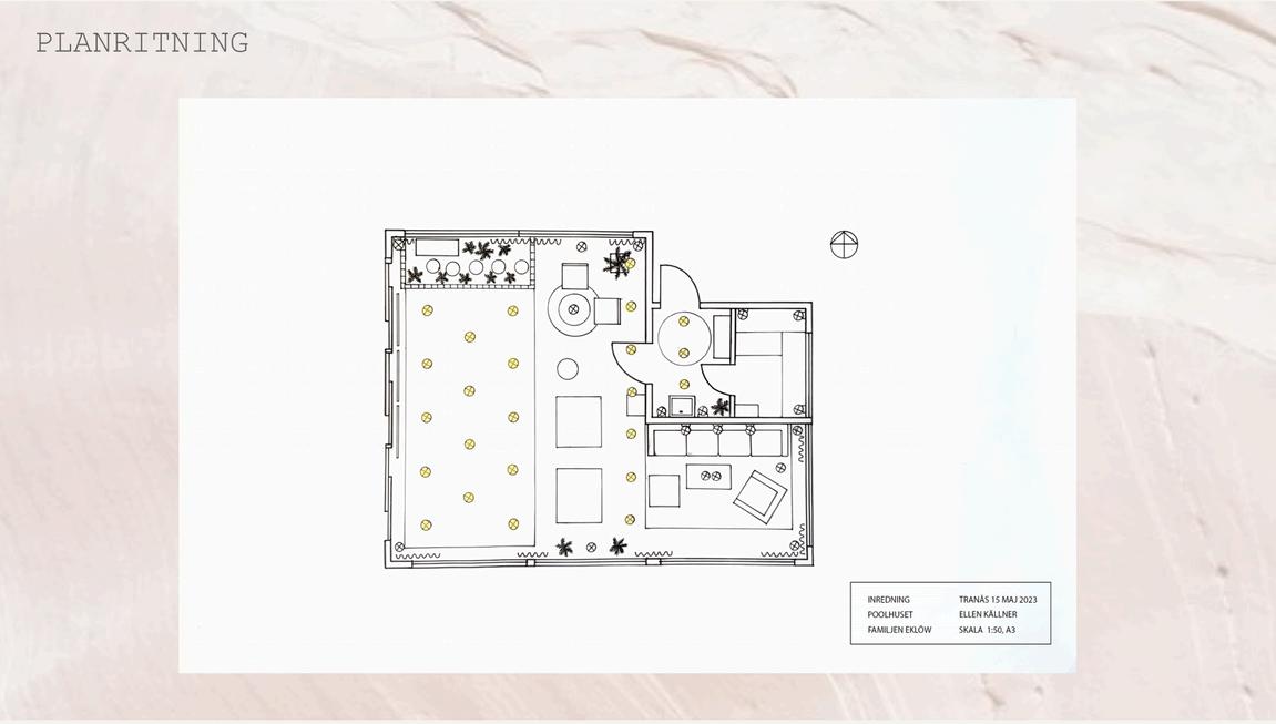 Till höger är en planritning från när jag fick i uppgift att komma på ett förslag till en inredning i ett poolhus till en fiktiv kund efter deras önskemål.
