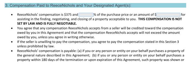 That’s a great question! Our minimum commission is 3% or $5000, whichever is greater. Should the chosen property generate a commission that is less, the Buyer will pay the difference at closing. Due to the amount of administrative time/work involved, once under contract, should the Buyer decide to cancel the contract, an additional $225 administrative fee per canceled contract will be assessed at time of final closing or ending of agency agreement