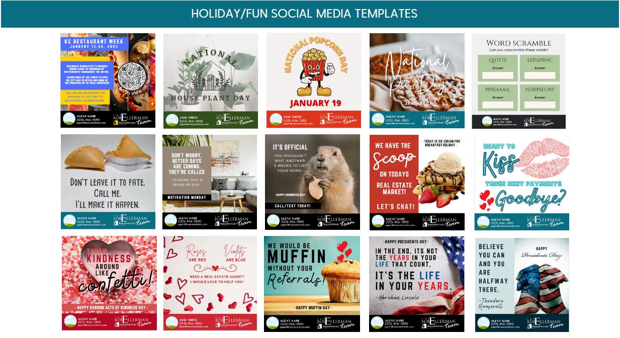 Our Marketing Department has a template library that is updated monthly with content for your social media. They also have staff who are dedicated solely to social media and are there to assist agents as needed.