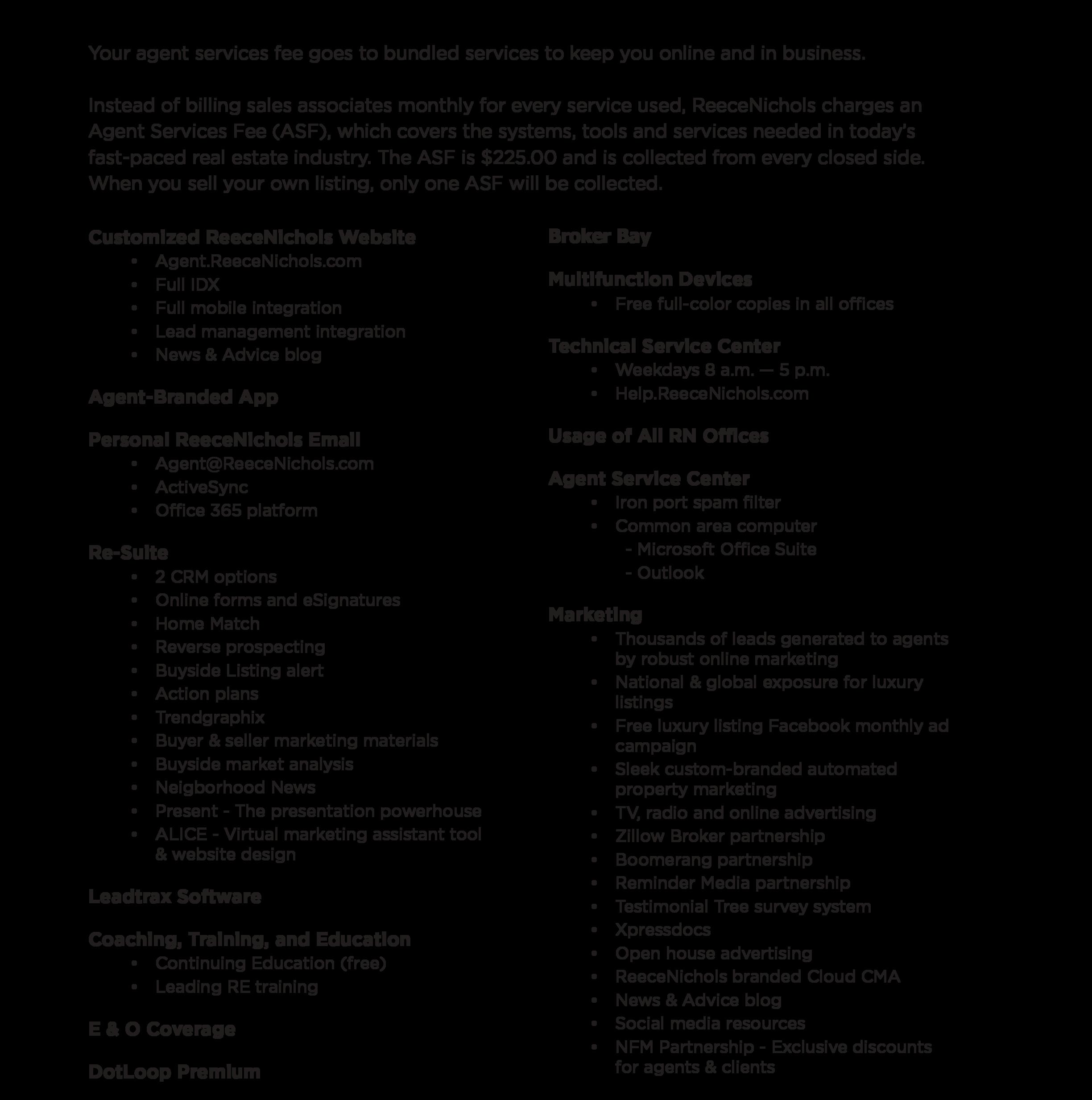Instead of billing sales associates monthly for every service used, Reece Nichols Realtors have an Agent Services Fee (ASF) which covers the systems, tools, and services needed in today’s fast-paced real estate industry. The ASF is $225.00 and is collected from every closed side. This fee is increased to $350 for transactions over $1M. A $425 Reece Nichols transaction fee is charged to your client on each transaction.