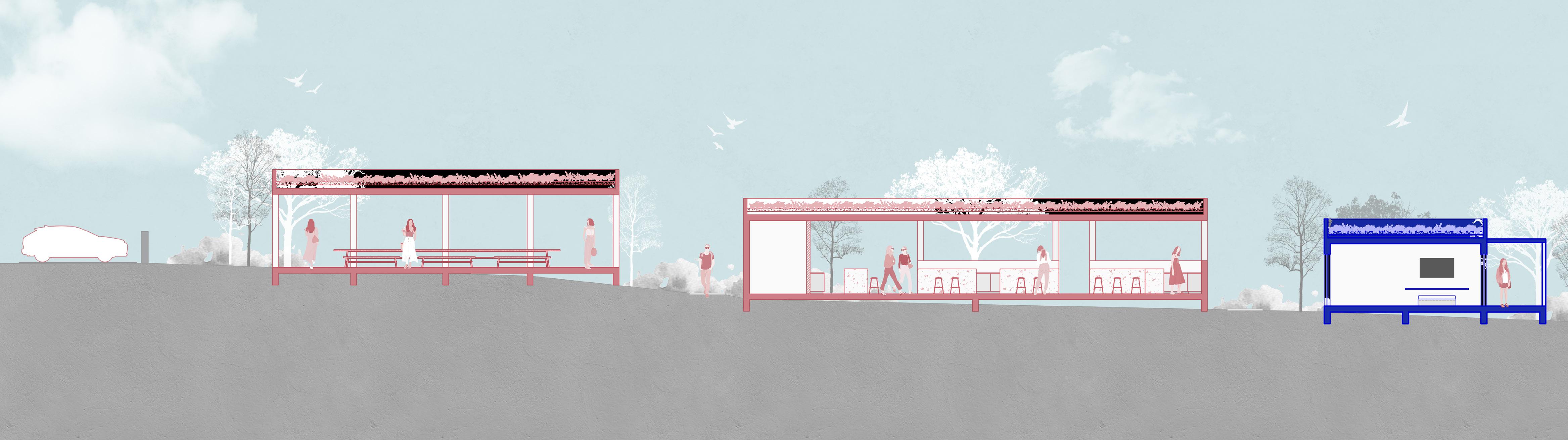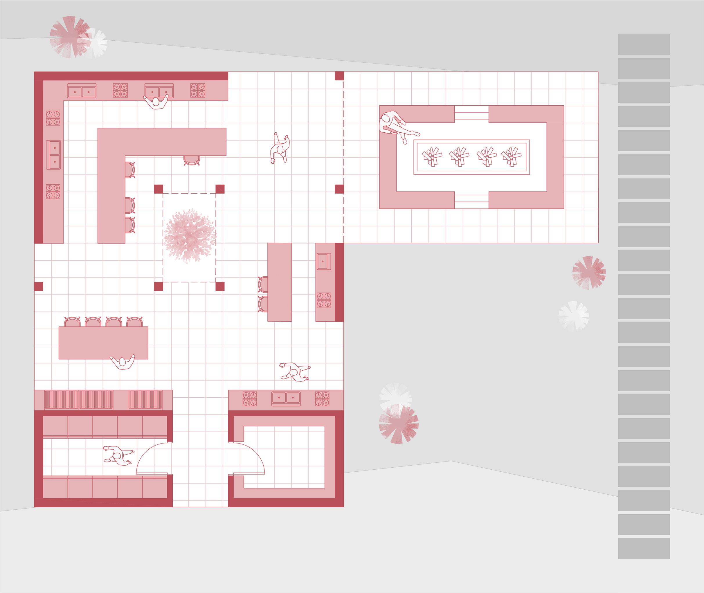06Β ΚΟΥΖΙΝΑ ΗΜΙΥΠΑΙΘΡΙΑ ΤΡΑΠΕΖΑΡΙΑ Α ΚΑΤΟΨΗ ΚΛ. 1:100 ΗΜΙΥΠΑΙΘΡΙΑ ΚΟΥΖΙΝΑ Α ΚΑΤΟΨΗ ΚΛ. 1:100 Η δεύτερη κοινότητα, η Κουζίνα όπως ονομάζεται, περιλαμβάνει δυο υμιυπαίθριες κουζίνες και δυο ημιυπαίθριους χώρους φαγητού. Στις δυο πρώτες οι επισκέπτες