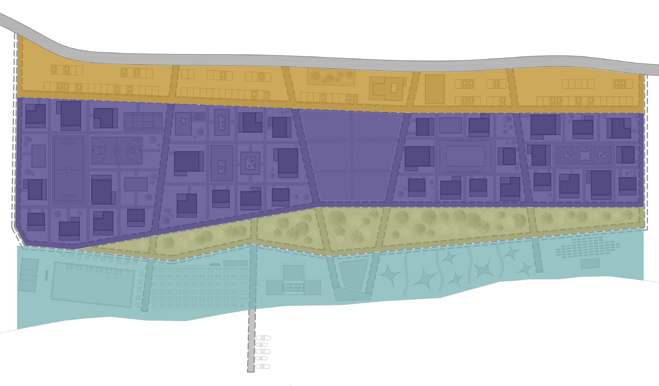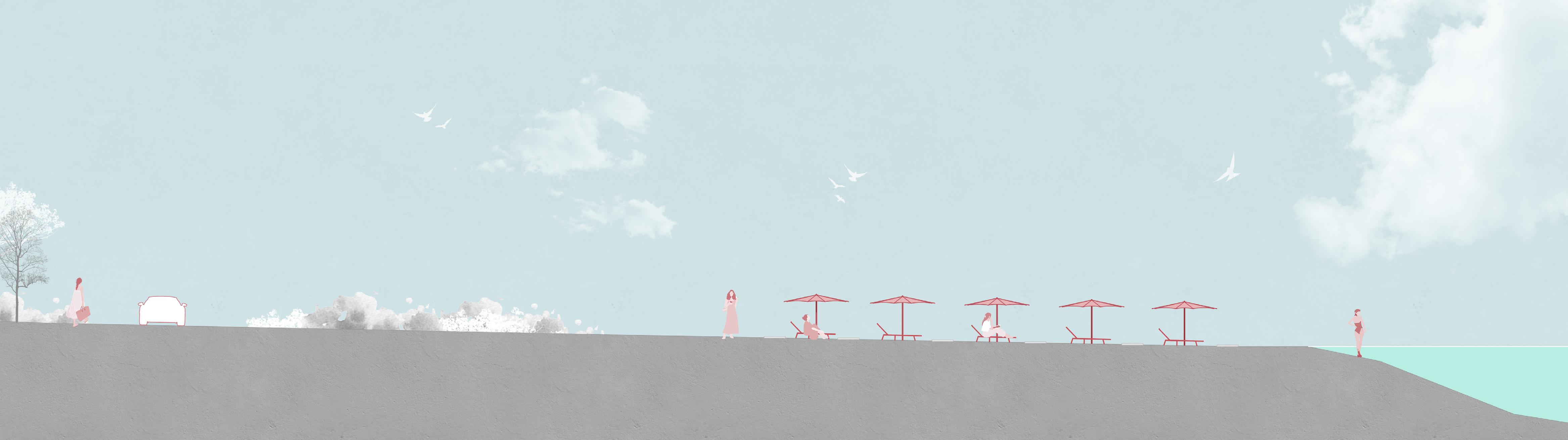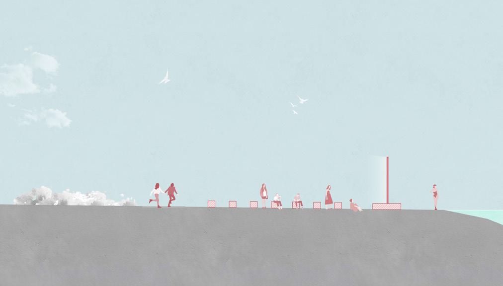 07 ΠΑΡΑΛΙΑΚΗ ΖΩΝΗ Κοινόχρηστα προγράμματα εντοπίζονται και στο χώρο της παραλίας ως προέκταση των κοινοτήτων. Πιο συγκεκριμένα το παραλιακό μέτωπο διαμορφώνεται από έναν χώρο πισίνας, ένα οργανωμένο τμήμα με ξαπλώστρες και ομπρέλες, ένα εστιατόριο, ένα μπαρ, ένα χώρο σκίασης για ομαδικές δραστηριότητες και ένα χώρο προβολών-εκδηλώσεων. Επιπλέον διάδρομοι διευκολύνουν την διασύνδεση των προγραμμάτων, ενώ στην ακτή έχουν τοποθετηθεί βοηθητικοί χώροι όπως ντουζιέρες, χώροι αλλαγής ρούχων και τουαλέτες. Στο εστιατόριο της παραλίας οι επισκέπτες μπορούν να εξυπηρετηθούν από το προσωπικό του συγκροτήματος και να παραλάβουν το γεύμα τους. Τέλος, κοντά στο χώρο του μπαρ υπάρχει εγκατεστημένος στεγασμένος κινητός χώρος για πρόχειρο φαγητό. Πισίνα Οργανωμένος Χώρος Παραλίας Χώρος Σκίασης Χώρος Προβολών - Εκδηλώσεων