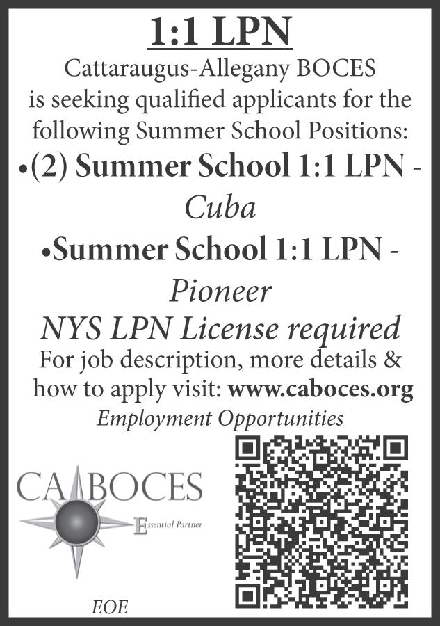 New York has closed primaries, with only enrolled members of a party being able to vote in a party’s primary. Anyone changing a party enrollment after Feb. 14 will remain in the party they were registered in previously until July 7. For more information, contact the board of elections at (585) 2689294 and 585-268-9295, or visit www.alleganyco.gov/departments/ board-of-elections.