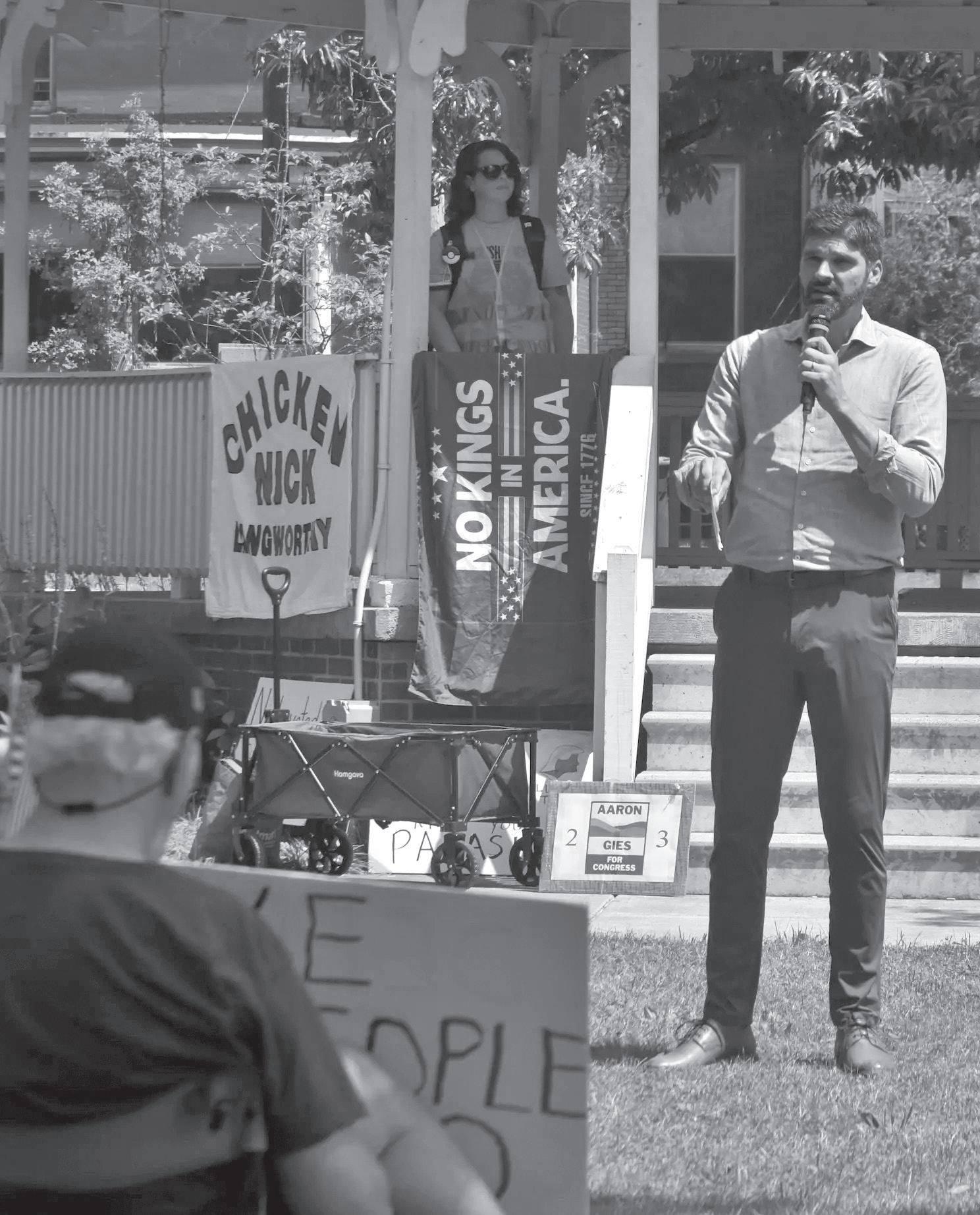 GIES, 44, OF OLEAN and an assistant professor of theology and Franciscan Studies at St. Bonaventure University, began to travel in what is the 23rd District, attending meetings, demonstrations and town hall-style events organized by Democrats and progressives opposed to Trump and his policies. In the spring, he began to be introduced as someone who was considering a run for Congress.