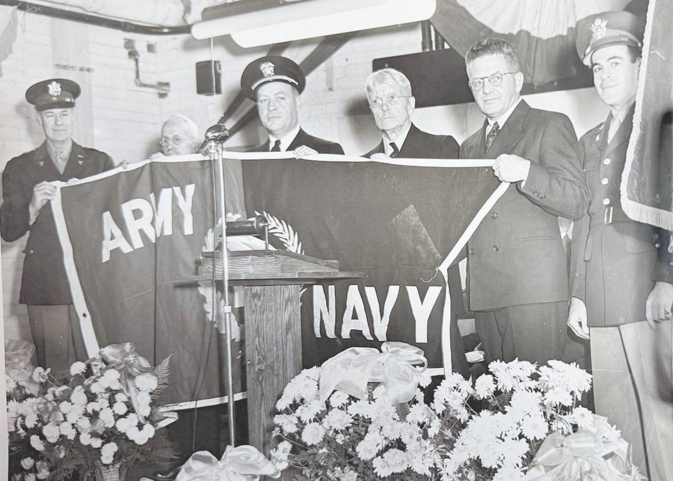 The late J.B.F. Champlin, then president of the Cattaraugus Cutlery Company, is shown (second from right) proudly accepting the “E” Flag at a ceremony held at the factory in 1944.