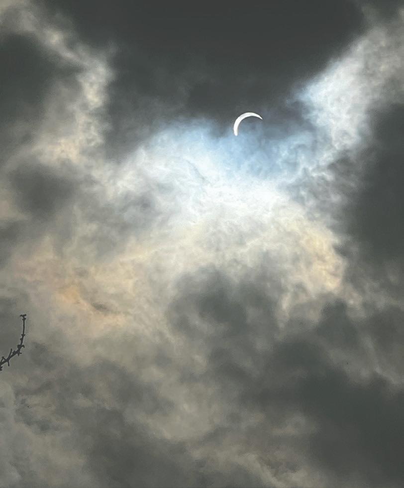 needing no translation. This photo captured a fraction of a second in time, showing wisps of solar energy and light fighting to get around the dark side of the moon. It feels like a secret look into the cosmos and the celestial dance of the Earth, moon and sun, all running rings around each other at incomprehensible speeds. The photo reminds me of ancient Native American rock art, depicting the solar eclipses our ancestors watched, just like us.